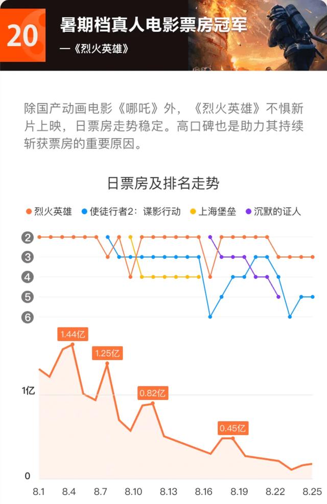 最终,《哪吒》凭借46亿的票房成绩登上了中国影史第二的位置,《烈火英雄》则斩获16亿元,成为暑期档第二热门的爆款佳片。由博纳影业、阿里影业出品的《烈火英雄》,用正能量的影视作品来致敬当代英雄、展现时代精神,最终收获了票房与口碑(淘票票9.2分)的双丰收。