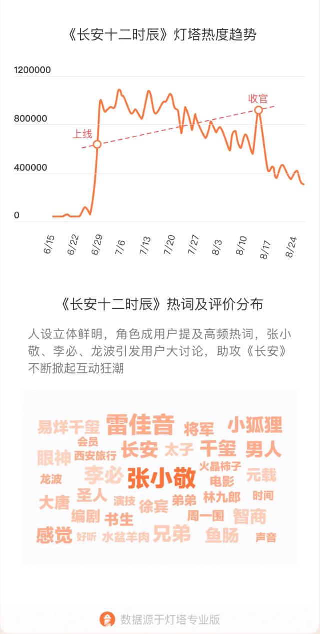 同时,优酷《长安十二时辰》(简称《长安》),也是今年暑期档唯一口碑热度双赢的剧集,爆款内容带动旅游、美食等行业共享文化红利,搅动唐文化和西安历史文化名城升温,影响力全面出圈,成为今夏文化标杆。数据显示,《长安》的灯塔热度(注:衡量作品在全网社交、搜索指数等舆情热度中的综合表现)高开高走,6月22日上线第二天即破100万,凭借其精良的制作和丰富的文化内涵,该剧在收官阶段的热度再攀高峰。