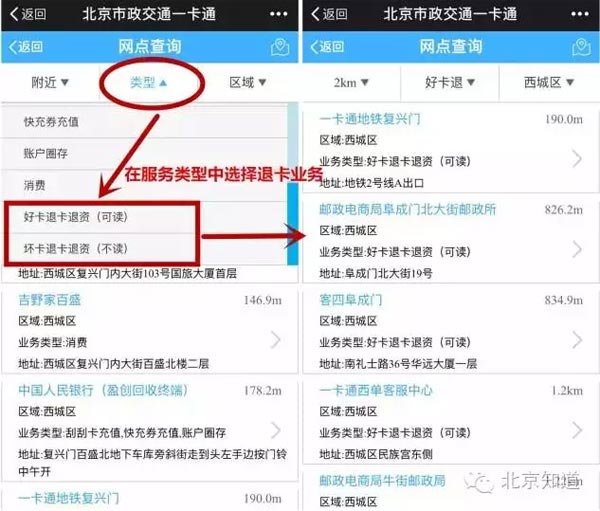 大家关注公众号后,在“贴心服务”中选择“网点查询”,然后在“类型”中选择你手中的一卡通是“好卡退卡退资”,还是“坏卡退卡退资”,就可以查询到离你最近的网点啦!