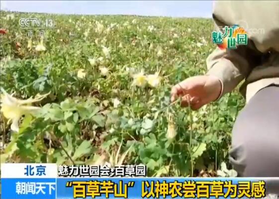 央视记者 罗子瑛:一进“百草园”看到的这座开满鲜花的小山名叫“百草芊山”,是根据神农尝百草的故事设计的。你能想象吗?这些开满鲜花的都是中草药,花朵像铃铛的叫华北耧斗菜,正值花期,还有即将开花的板蓝根等等。游客爬上这座山不仅可以闻到阵阵药香,还能感受先贤踏遍千山,遍尝百草的艰辛。