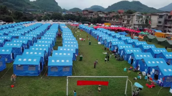 6月19日中午,此前应急管理部紧急调运的5000顶帐篷、1万张折叠床和2万床棉被,已陆续发放到受灾群众手中。在四川宜宾长宁双河中学安置点,操场上搭起了一排排的帐篷,近1500名受灾群众被安置在这里。临近傍晚,武警官兵准备了热饭、热菜,受灾群众在保障点的前面排起长队。