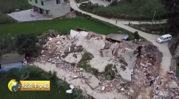 从6月18日的航拍画面上可以看到,一处联排的砖房由于地震,一层已经完全垮塌,被二层全部掩盖。据当地村民介绍,这里本来有三户人家,都是亲戚。