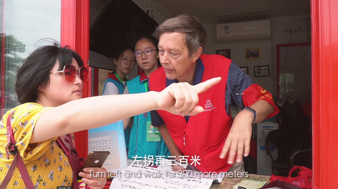 高天瑞,一个高个子的美国大爷,每天准时出现在北京什刹海荷花市场的志愿服务亭里,亲切地用汉语和英语为游客指路。