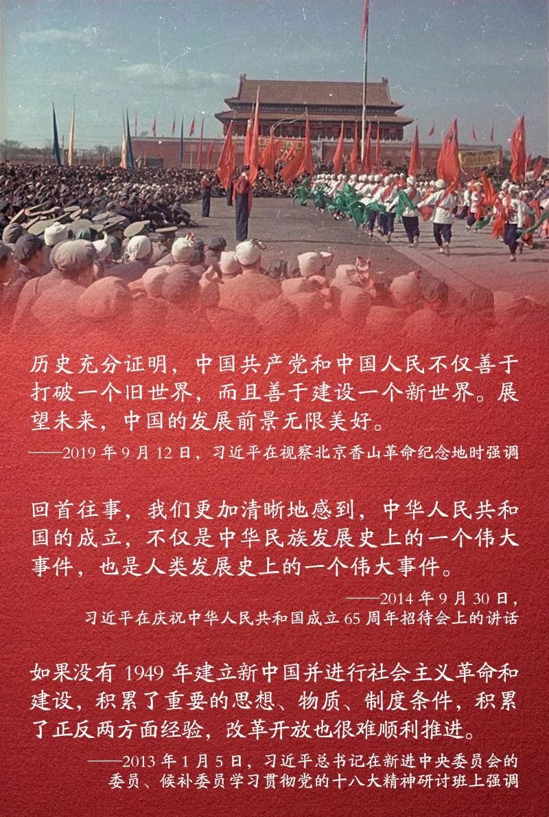 9月23日,习近平前往北京展览馆,参观“伟大历程 辉煌成就——庆祝中华人民共和国成立70周年大型成就展”。 他强调,新中国成立70年来,我们党不忘初心、牢记使命,团结带领全国各族人民战胜了一个又一个艰难险阻,创造了一个又一个彪炳史册的人间奇迹,中华民族迎来了从站起来、富起来到强起来的伟大飞跃。 70年来我国取得的历史性成就、发生的历史性变革,充分说明只有中国共产党才能领导中国,只有社会主义才能救中国,只有改革开放才能发展中国、发展社会主义、发展马克思主义,只有中国特色社会主义道路才能引领中国走向繁荣富强。 70年后再出发,而今迈步从头越。 要展示好、宣传好新中国波澜壮阔的发展历程、感天动地的辉煌成就、弥足珍贵的经验启示,激励全党全国各族人民更加紧密地团结在党中央周围,高举中国特色社会主义伟大旗帜,团结一致、锐意进取,为决胜全面建成小康社会、夺取新时代中国特色社会主义伟大胜利、实现中华民族伟大复兴的中国梦、实现人民对美好生活的向往而不懈奋进。