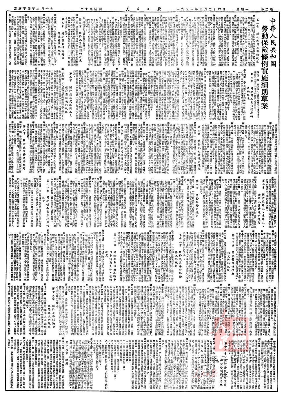 1951年3月26日《人民日报》第二版全文刊发《中华人民共和国劳动保险条例实施细则草案》