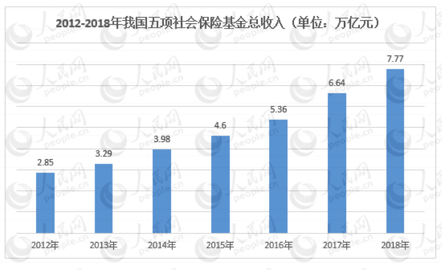 不妨看一组数据:2012年至2017年,我国五项社会保险基金总收入分别为2.85万亿元、3.29万亿元、3.98万亿元、4.60万亿元、5.36万亿元和6.64万亿元,2018年达7.77万亿元。每年同比增速都在10%以上。