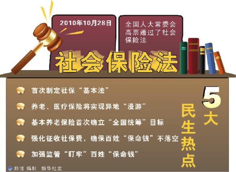2010年10月28日,第十一届全国人大常委会第十七次会议通过《社会保险法》,自2011年7月1日起施行。 来源:新华社
