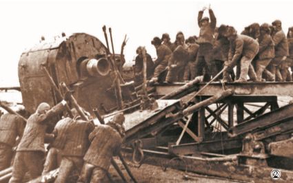 大会战时期,王进喜(中)和钻井工人们人拉肩扛运钻机,保障钻井作业。资料图片